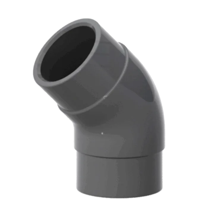 Codo de PVC SCH 80 a 45° para cambios de dirección en sistemas de tuberías industriales. Fabricado conforme a ASTM D1784 para conexión cementada.