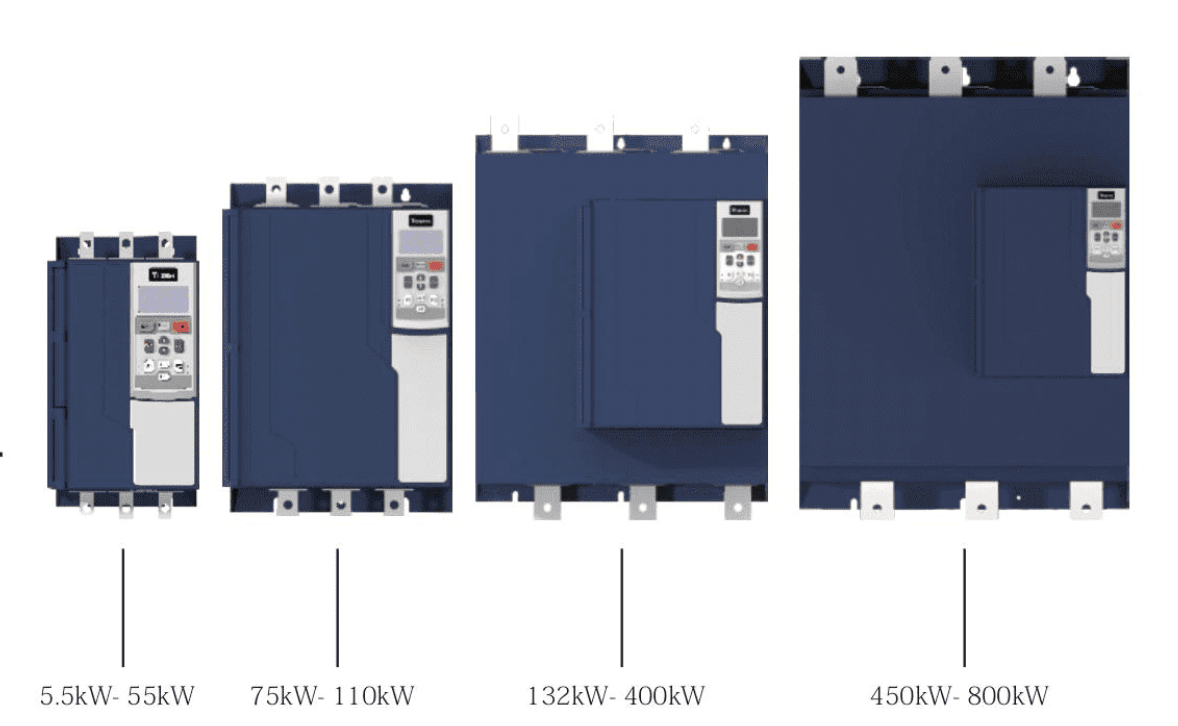 La tecnología típica usa **tiristores (SCR)** en dos o tres fases para “recortar” la onda y así bajar el voltaje efectivo al inicio.